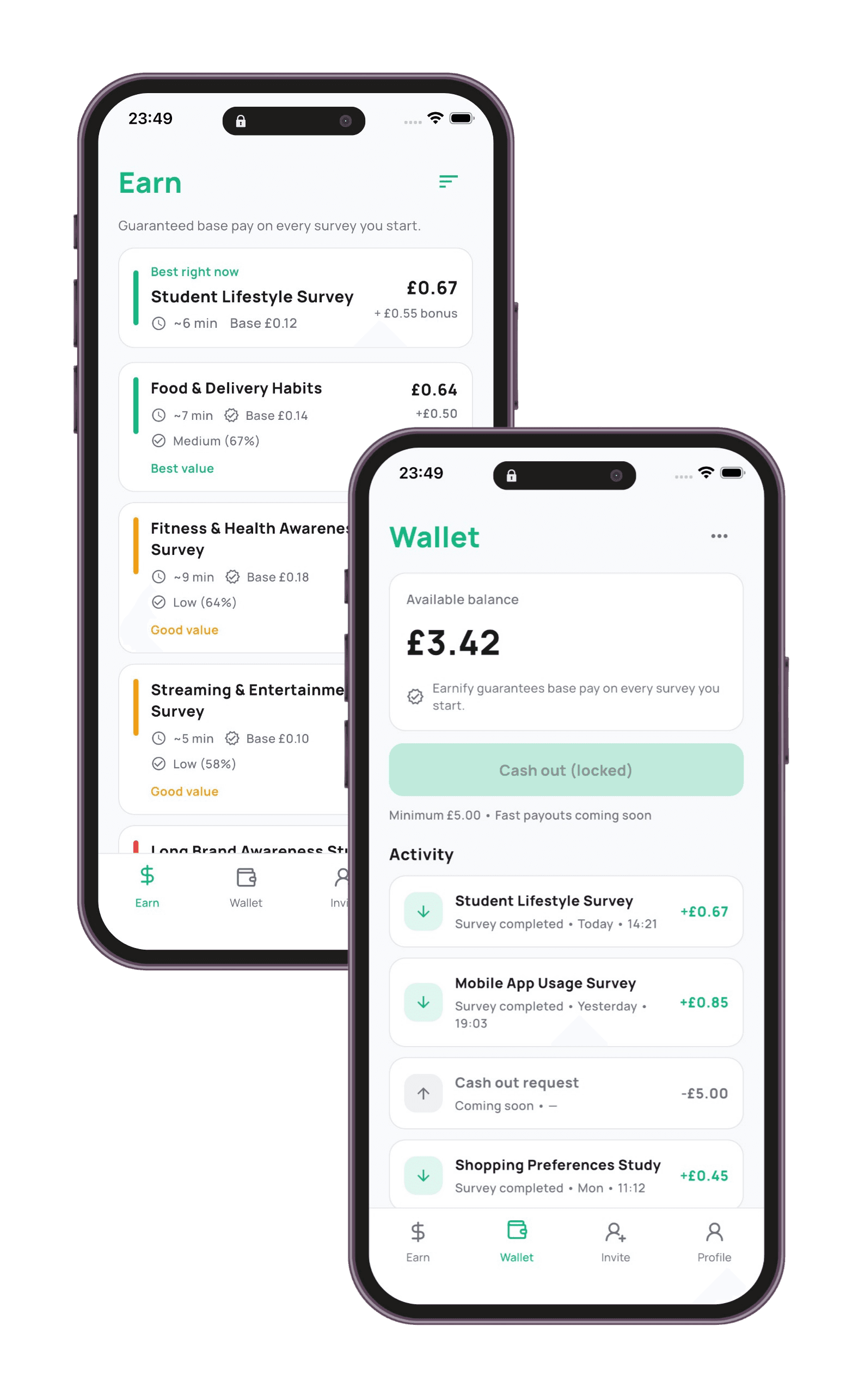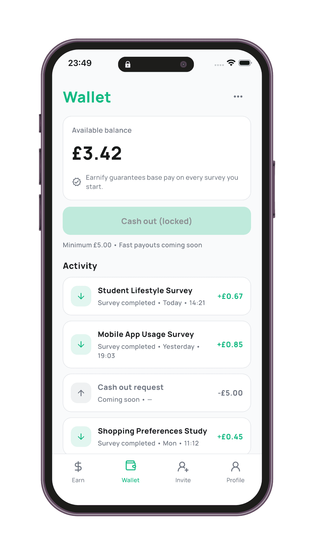 No unpaid rejections. Ever. Most survey apps only pay if you fully qualify. Earnify guarantees base pay for every survey you start, so your time is never wasted — even if you’re screened out.