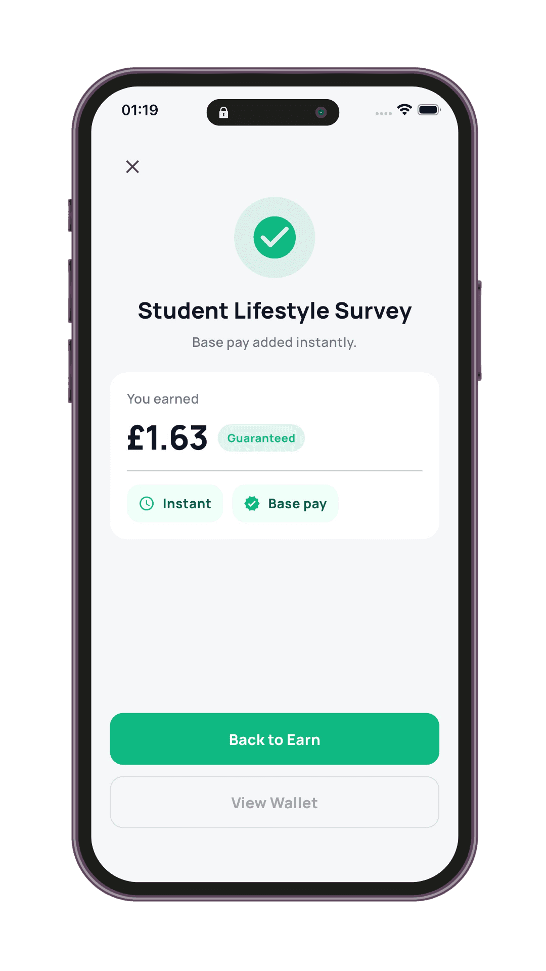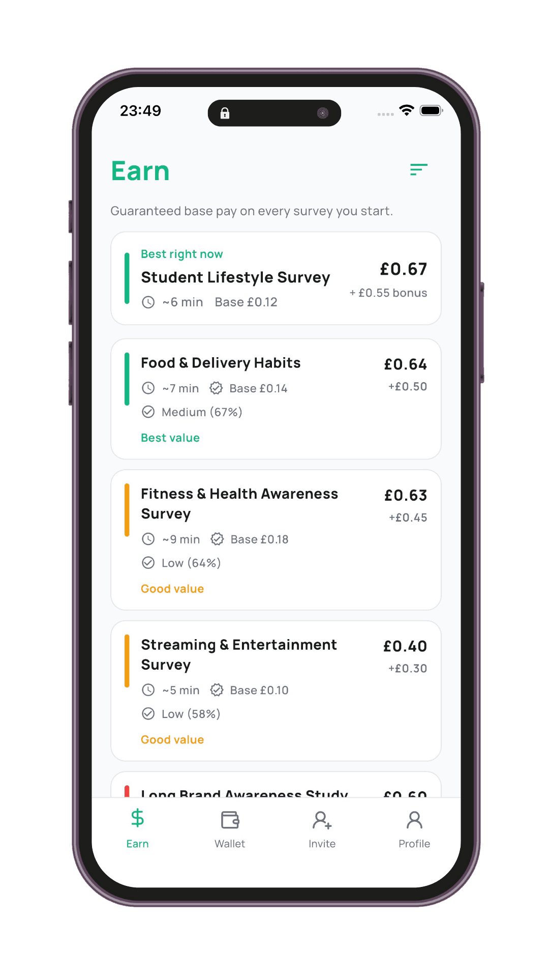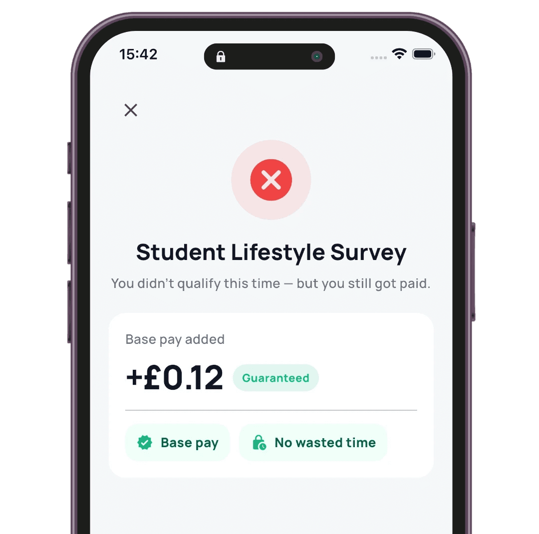 Earnify guarantees base pay for every survey you start - no wasted time, no unpaid rejections